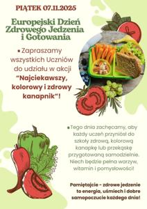 Dnia 7 listopada w naszej szkole obchodziliśmy Europejski Dzień Zdrowego Jedzenia. Uczniowie przygotowali w domu zdrowe, kolorowe kanapki i przekąski, które przynieśli do szkoły.W ramach obchodów została również przygotowana gazetka o zdrowym odżywianiu, przedstawiająca zasady...