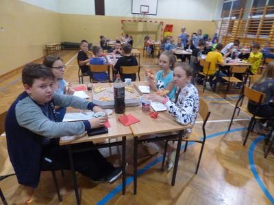 O godzinie 19 do szkoły przyjechała pizza. Po kolacji, opiekunowie przedstawili skład nowo wybranego Samorządu Uczniowskiego oraz poszczególne sekcje działające