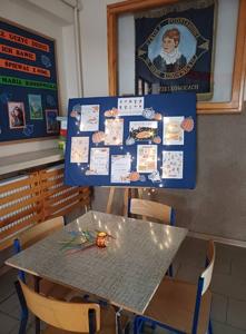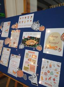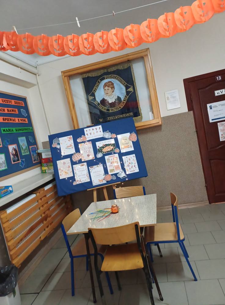 Na szkolnym korytarzu pojawił się jesienny kącik pełen klimatu i ciepła – lampiony, kolory jesiennych liści i... tablica z angielskim słownictwem, która pomoże utrwalić wyrazy związane z tą piękną porą roku. Znajdziecie tam słowa dotyczące jesiennych przedmiotów, sposobów na wyciszenie, aktywności na chłodniejsze dni, a nawet przepis na pyszne ciasto dyniowe!