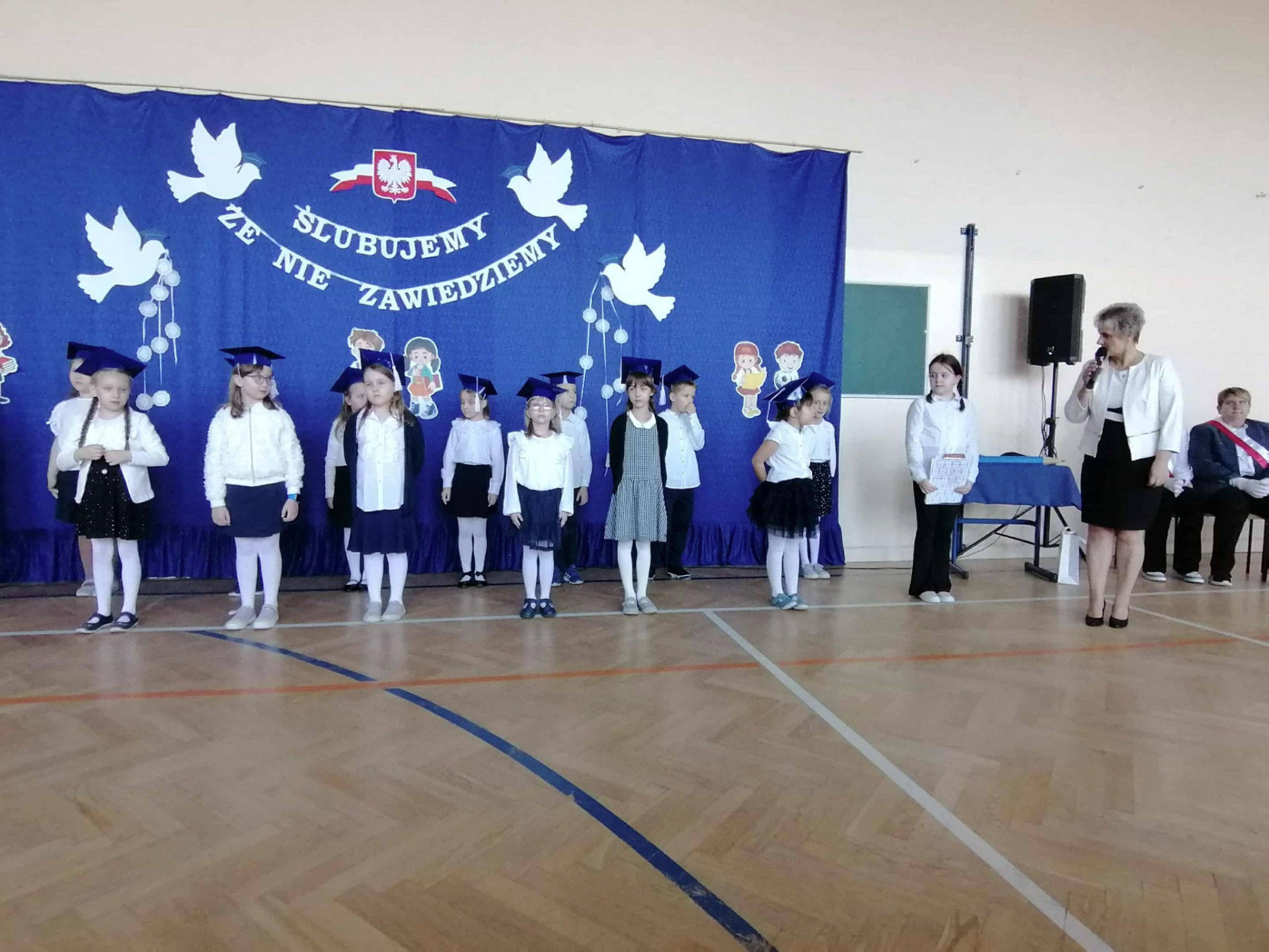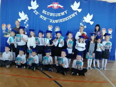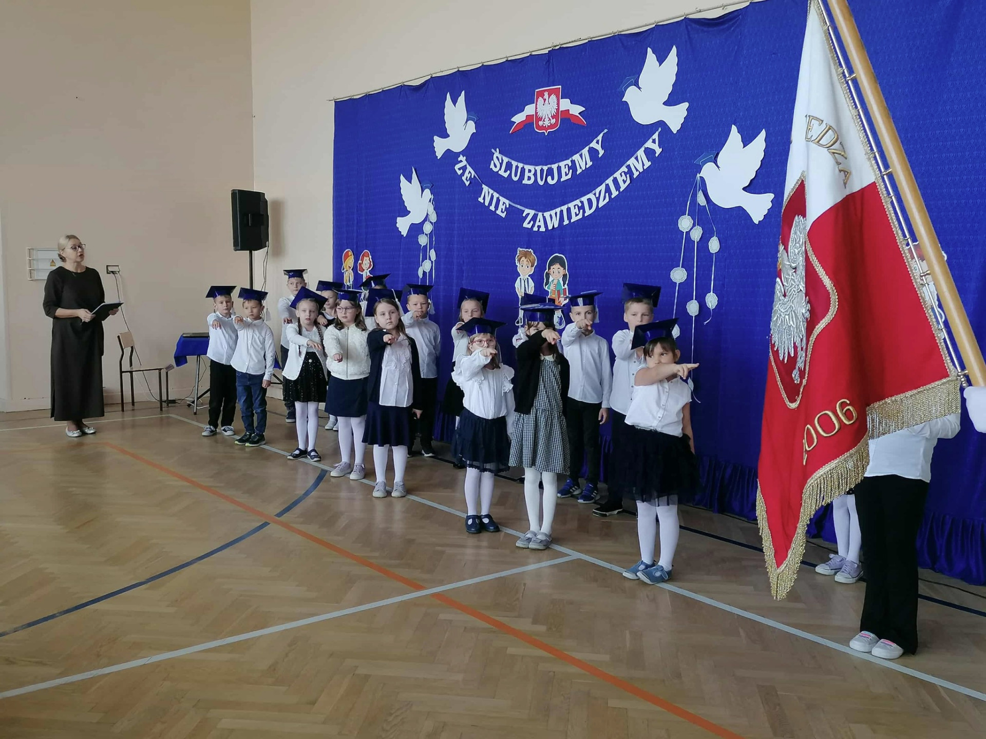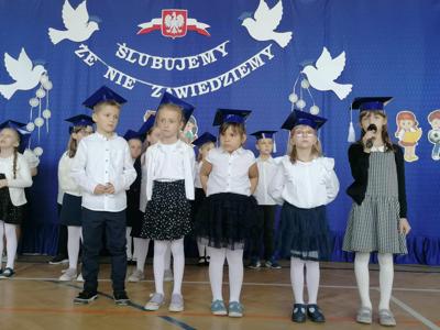 Po zakończeniu części artystycznej, w niezwykle podniosłej atmosferze, przed pocztem sztandarowym uczniowie ślubowali być dobrymi Polakami, godnie reprezentować swoją szkołę, swym zachowaniem i nauką sprawiać radość rodzicom i nauczycielom.