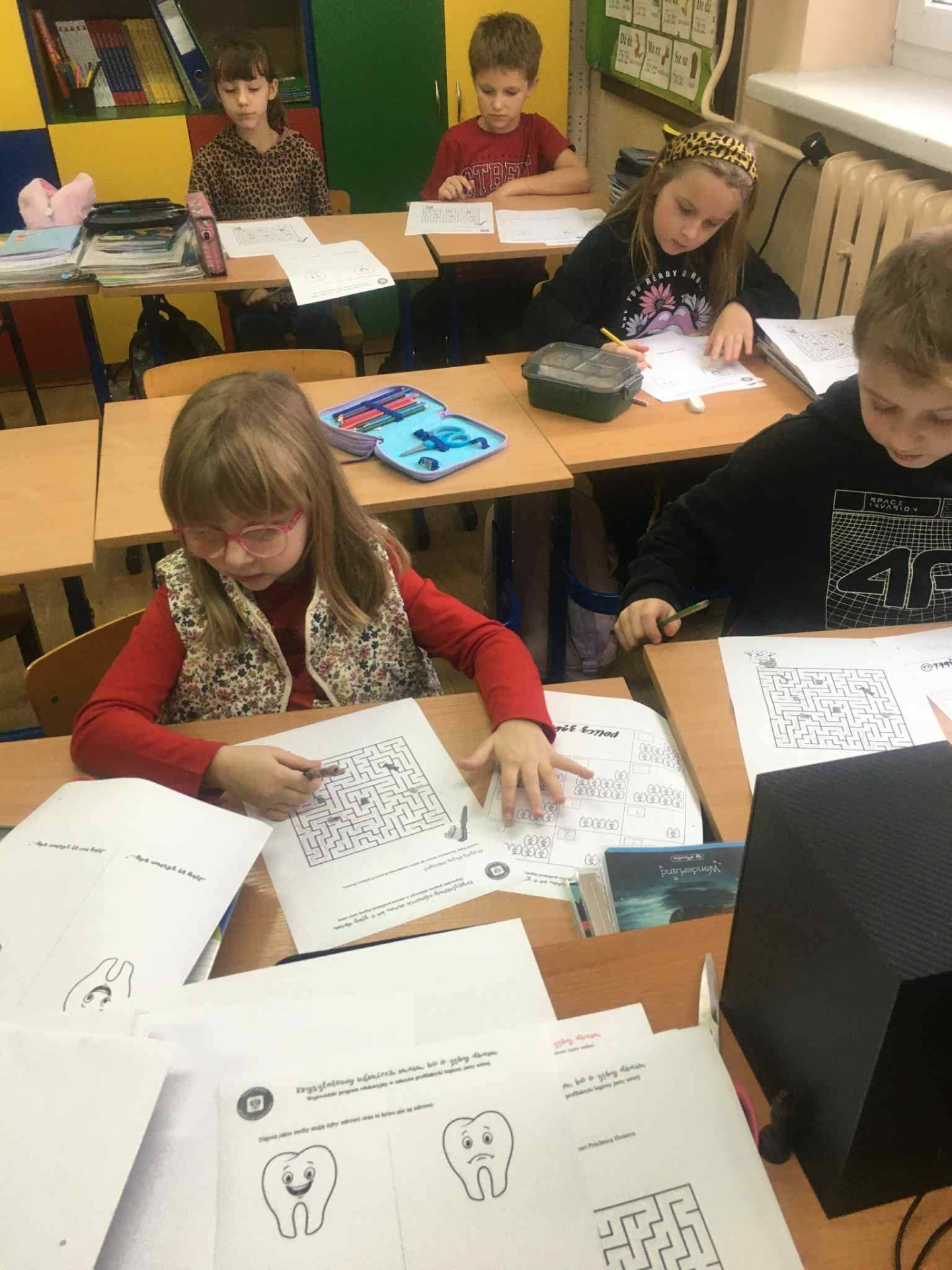 W tym roku szkolnym uczniowie klasy pierwszej realizują program profilaktyczny rekomendowany przez Powiatową Stację Sanitarno - Epidemiologiczną w Łowiczu „Kryształowy uśmiech mam, bo o zęby dbam”. W ramach zajęć dzieci oglądały ciekawe prezentacje multimedialne, rozwiązywały zagadki, wypełniały karty pracy, a także aktywnie brały udział w ćwiczeniach praktycznych. Uczyły się prawidłowych nawyków higienicznych poprzez zabawę, gry oraz działania angażujące wszystkie zmysły. Zajęcia miały nie tylko charakter profilaktyczny, ale także dydaktyczny - rozwijały świadomość zdrowotną uczniów, kształtowały odpowiedzialność za własne zdrowie i zachęcały do codziennej troski o higienę jamy ustnej.
