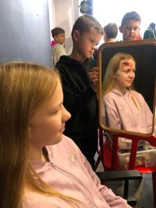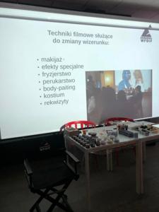 Podczas warsztatów z charakteryzacji poznaliśmy techniki makijażu i efektów specjalnych, które potrafią całkowicie odmienić wygląd aktorów. Warsztaty zilustrowane były przykładami metamorfoz oraz częścią pokazową. Każdy uczestnik pod okiem prowadzącej miał możliwość wykonania efektu charakteryzacji.